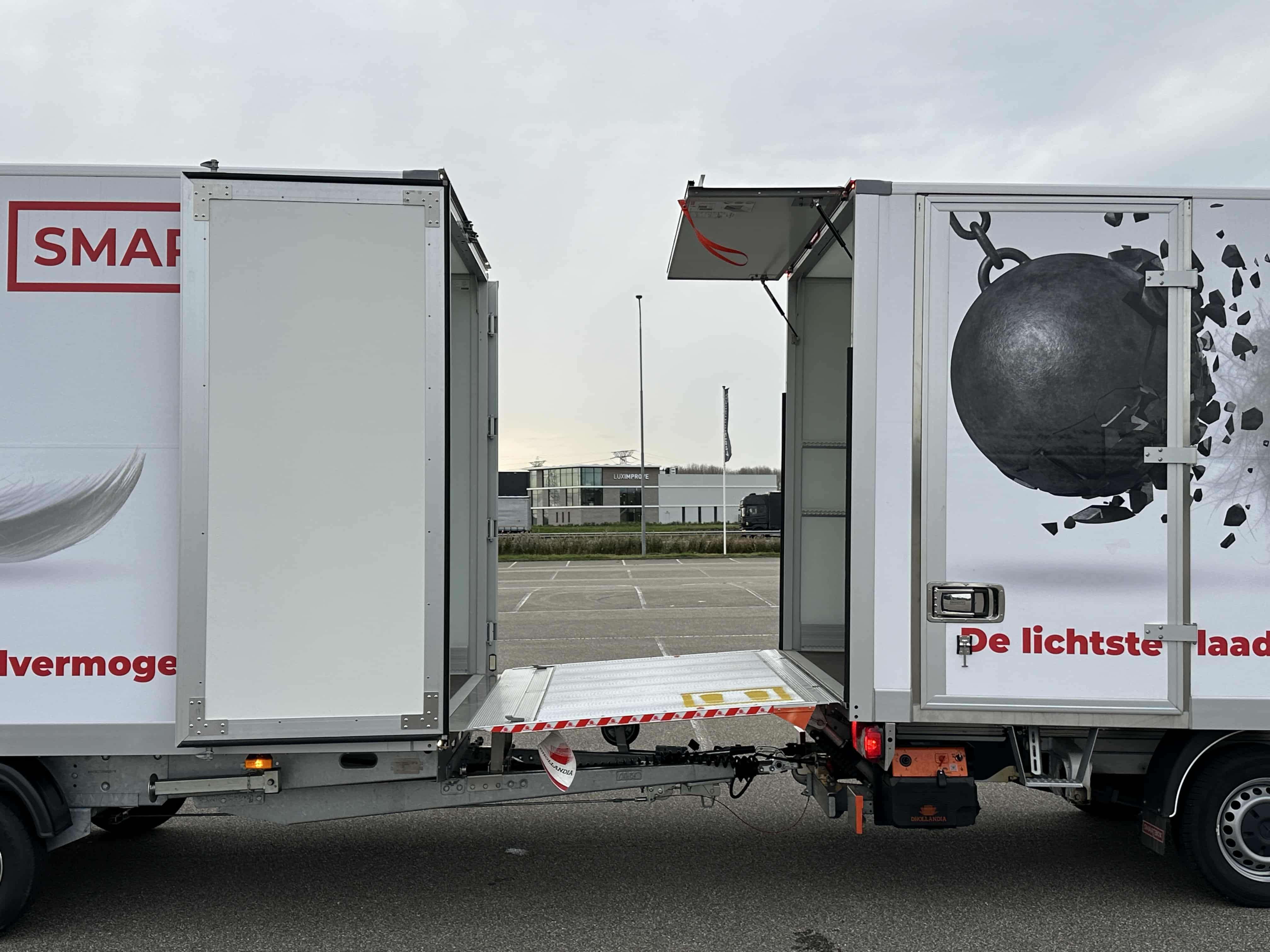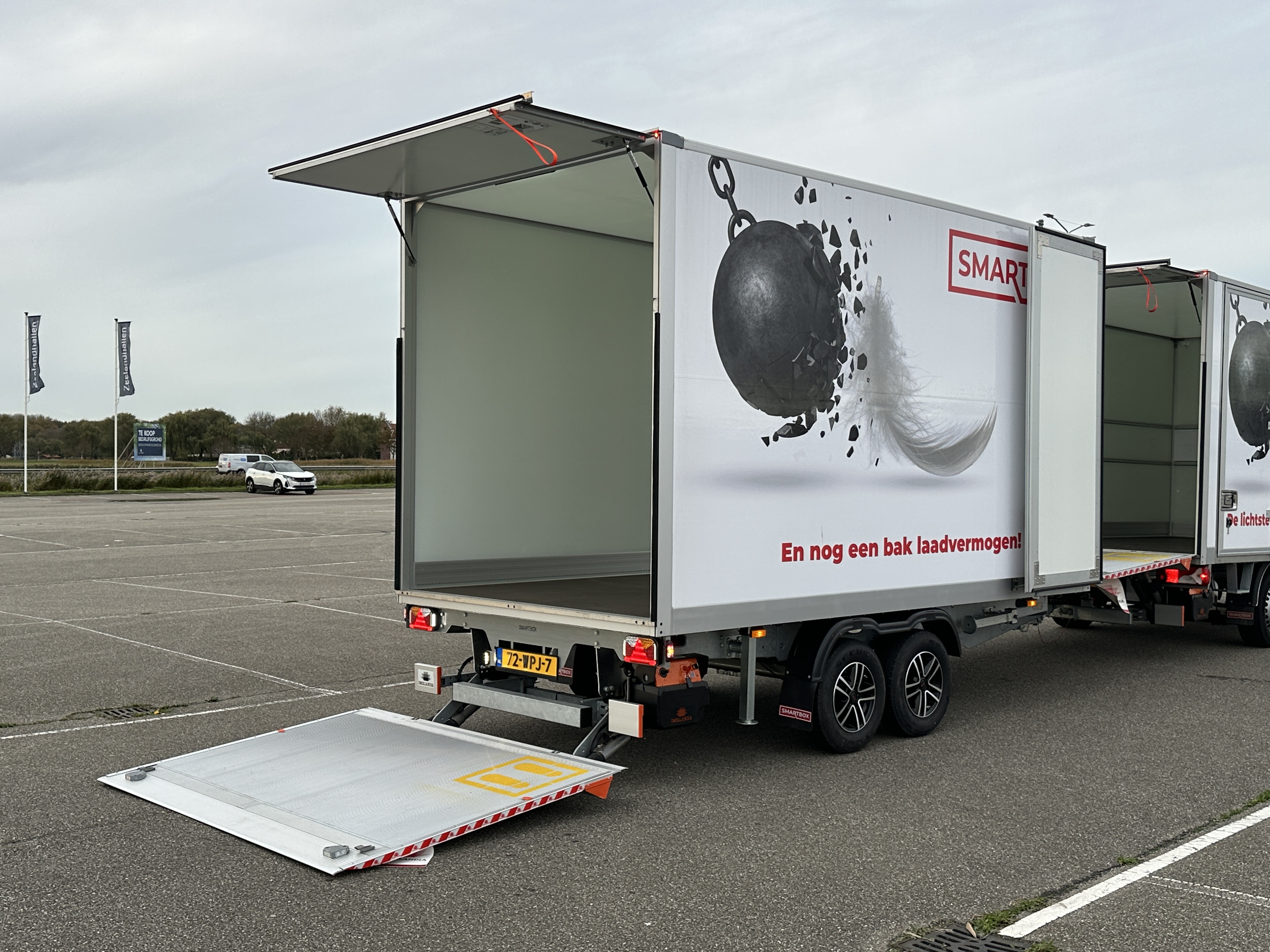Vanwege deze combinatie ideaal voor het vervoer van pallets/zware goederen met een bakwagen ervoor, ook voor de verhuur van apparatuur of andere zaken kan de Smartbox Light Plus ingezet worden vanwege de accu die de laadklep ‘stand-alone’ laat draaien.